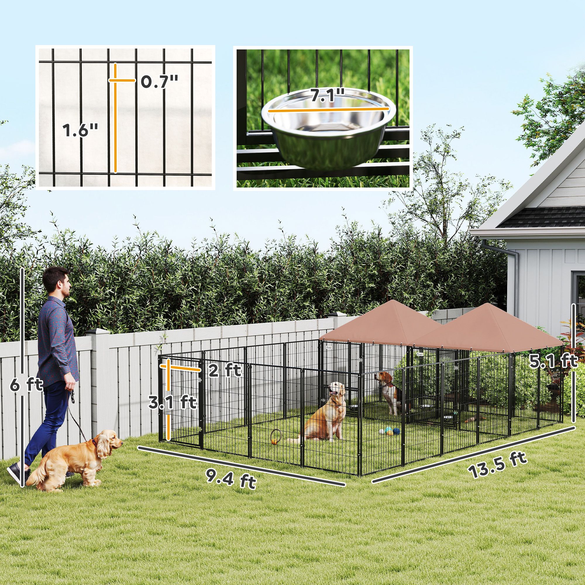 Experience the freedom of a spacious PawHut outside dog kennel. Featuring dual rooms and a large activity area, your pet can enjoy playtime and privacy in one secure space. The robust PVC-coated Oxford fabric provides reliable protection from the elements, while the 360° rotating bowl rack ensures easy hydration access. Suitable for dogs of large sizes and below, this versatile dog lot offers endless opportunities for outdoor fun and relaxation.