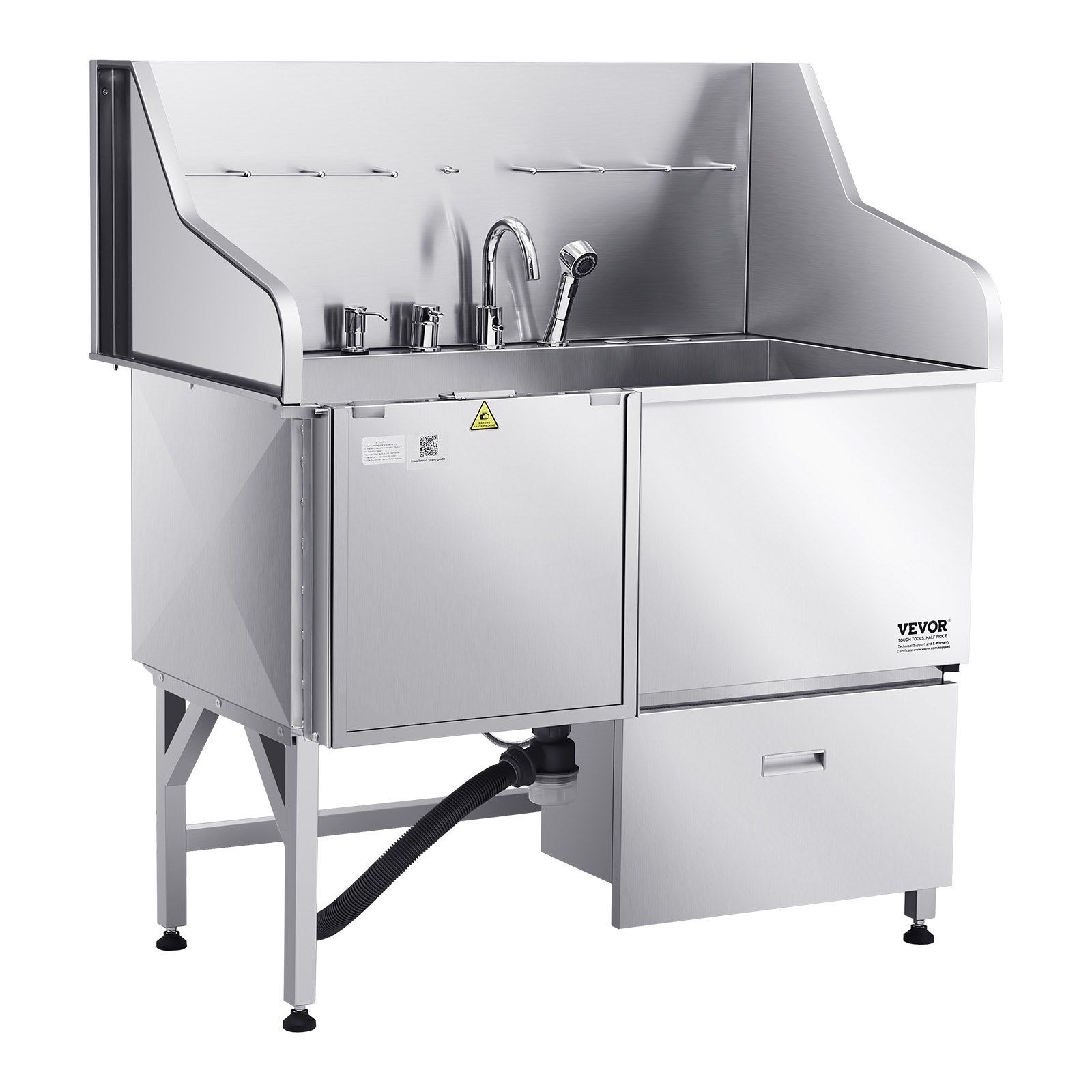 1.Integrated Design: The dog grooming tub is featuring hot and cold faucets, a dual-control showerhead, and a soap dispenser, this design makes pet bathing effortless and efficient. The PE water filter board provides a non-slip draining surface, while the 24 lbs (11 kg) storage cabinet securely stores grooming pet bath stations, keeping everything neat and organized, making pet bathing a breeze